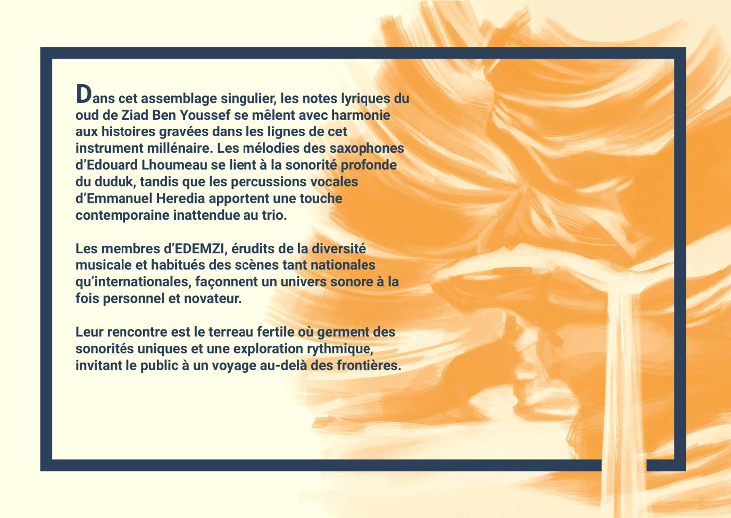 Conception d'une illustration, ainsi qu'un dossier de diffusion pour le trio musical EDEMZI, afin de développer l'univers visuel du groupe et de proposer un support technique et promotionnel.